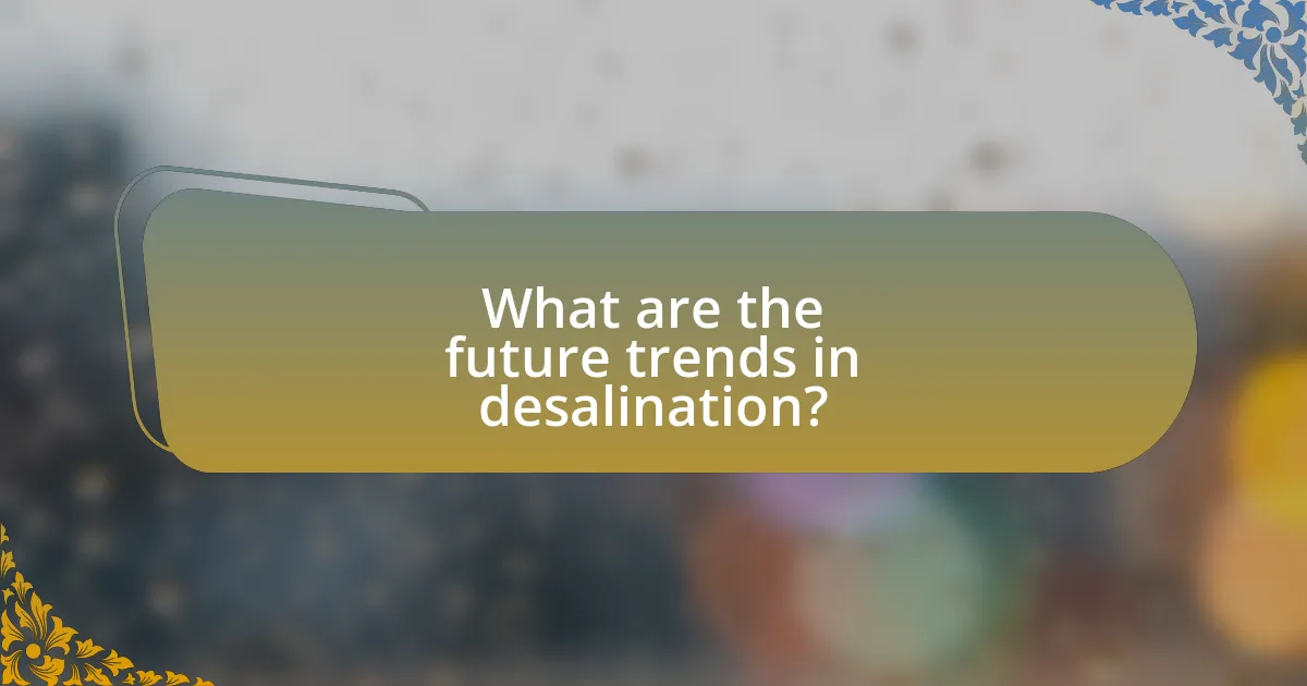Future trends in desalination include advancements in energy efficiency, the integration of renewable energy sources, and the development of innovative membrane technologies. Energy-efficient processes, such as reverse osmosis, are being optimized to reduce energy consumption, with some systems achieving energy recovery rates of over 90%. The use of renewable energy, particularly solar and wind, is being explored to power desalination plants, which can significantly lower operational costs and carbon footprints. Additionally, new membrane materials, such as graphene and biomimetic membranes, are being researched to enhance salt rejection and water permeability, potentially increasing the overall efficiency of desalination processes. These trends are supported by ongoing research and pilot projects demonstrating their feasibility and effectiveness in real-world applications.